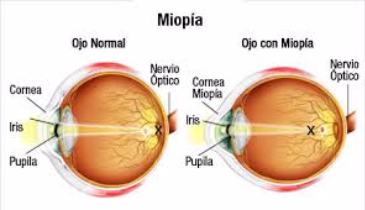 Miopía es un defecto del ojo, no una enfermedad, debido a un crecimiento excesivo en la longitud del globo ocular durante la infancia y adolescencia, que al hacer que las imágenes queden enfocadas por delante de la retina la visión de lejos disminuya espectacularmente, conservando solo la de cerca. Dicho desenfoque se mide en dioptrías. Así por ejemplo, cada milímetro de exceso de longitud se traduce en 3 dioptrías, pero sólo 1 dioptría produce que la visión de lejos disminuya al 60%, y 3 dioptrías producen que la visión de lejos sea inferior al 10% (pérdida del 90% de la visión!!!).